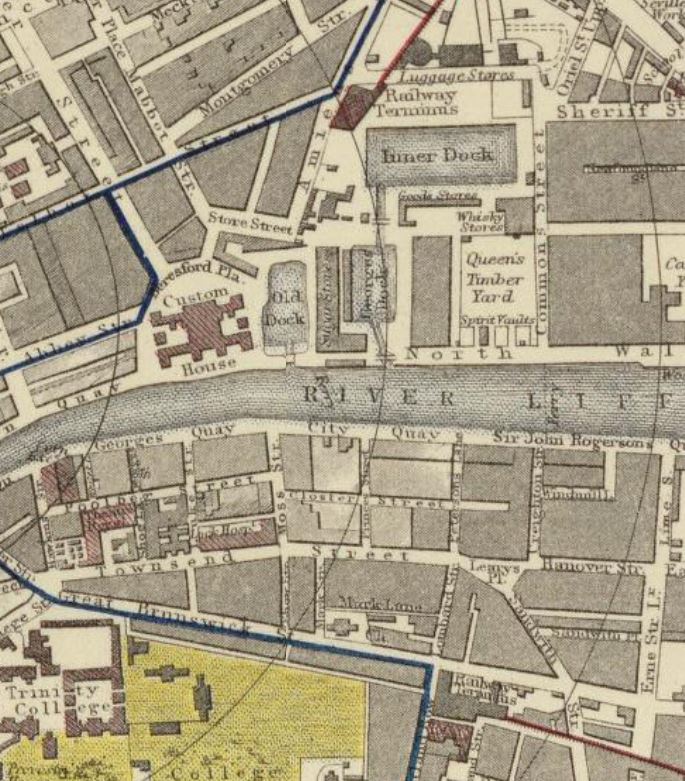 1883年出版の地図(Plan of the city of Dublin. Letts's popular atlas. Letts, Son & Co. Limited, London. )では駅はつながっていない。